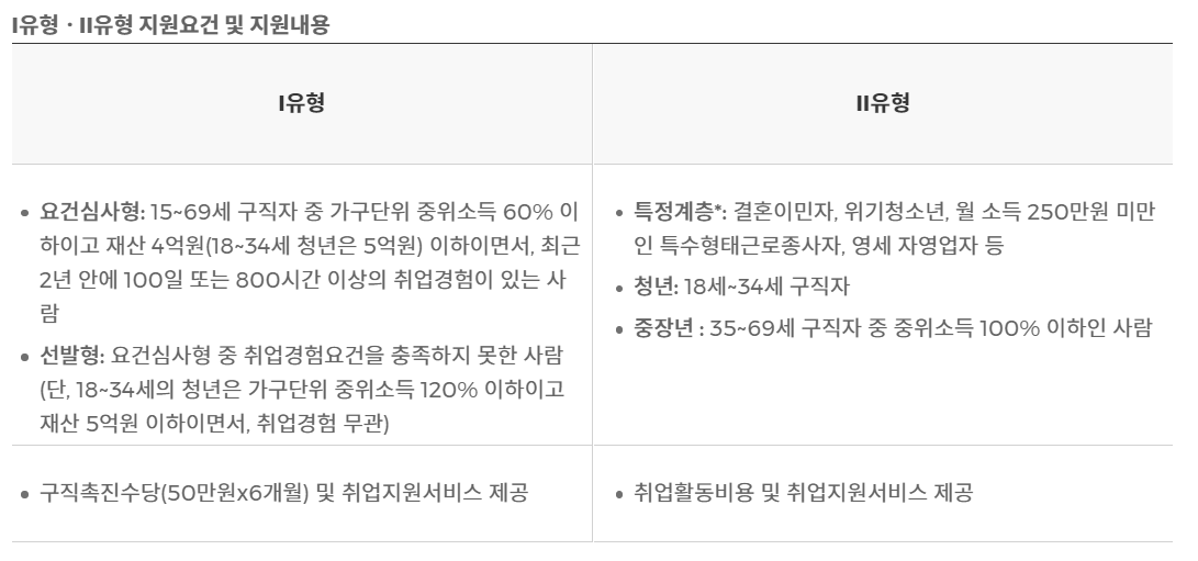 취업을 하고자 하는 사람에게 취업지원 서비스, 소득이 적은 구직자에게는 소득지원을 하는 제도입니다.