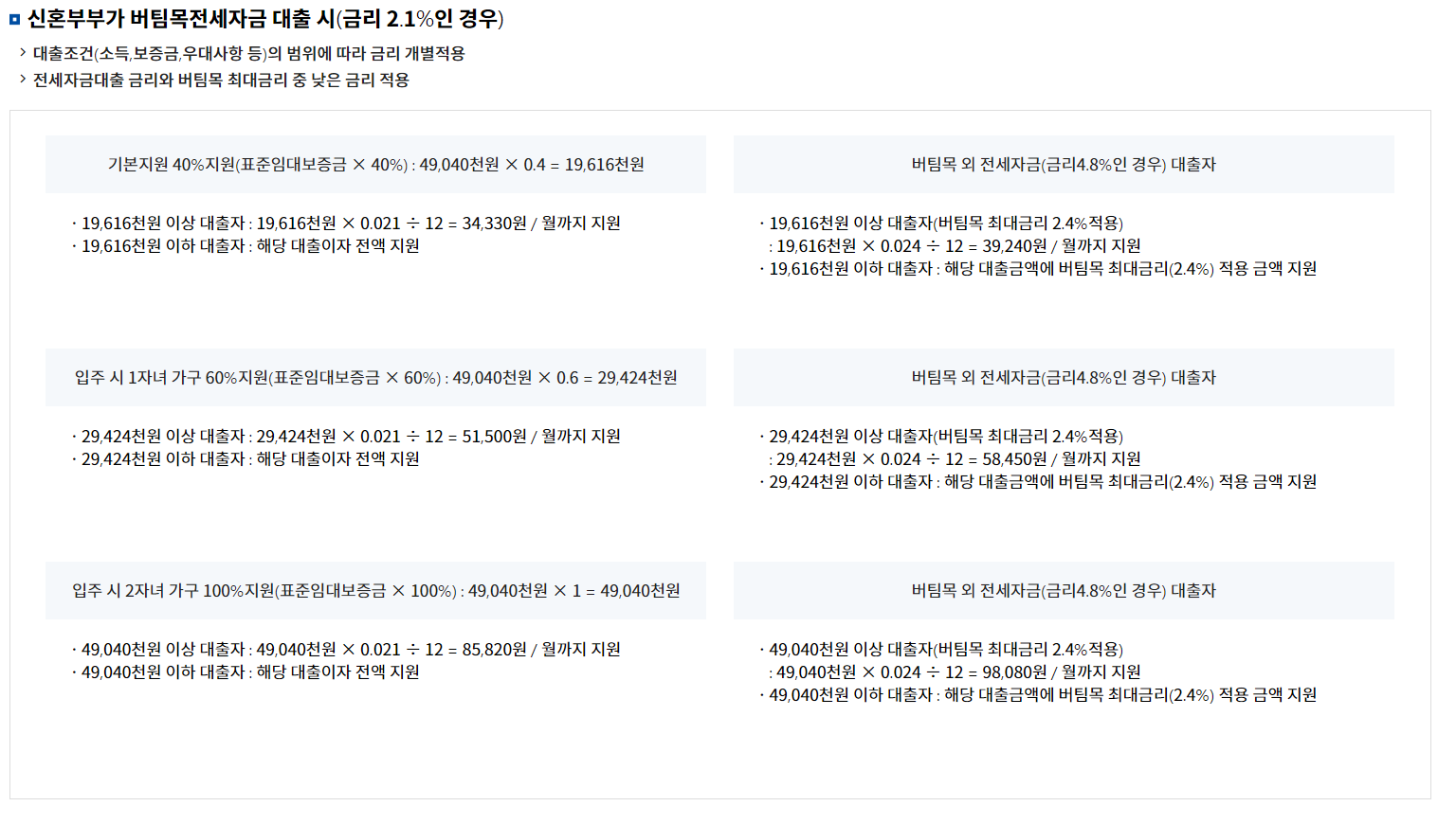 - 버팀목 외 대출자는 전세자금 대출 금리와 버팀목 최대금리 중 낮은 금리 적용