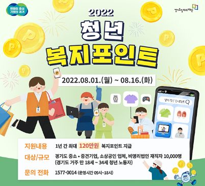 경기도에서 지원하는 청년 복지포인트로 연간 최대 120만원을 지원받을 수 있다고 합니다.