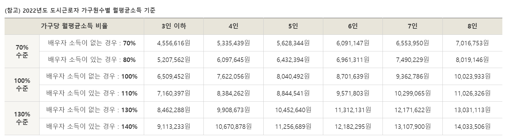 | 소득기준 | 전년도 가구당 도시근로자 월평균 소득 100% 이하(맞벌이 120%,) 단, 2인가구일 경우 110%(맞벌이 130%) | 전년도 가구당 도시근로자 월평균 소득 70% 이하 | ||