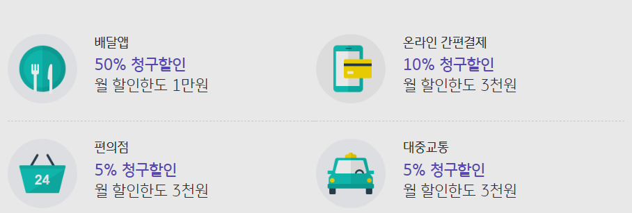 주요혜택 : 배달앱 50%청구할인 / 간편결제 10% 청구할인 / 교통.편의점 5%청구할인