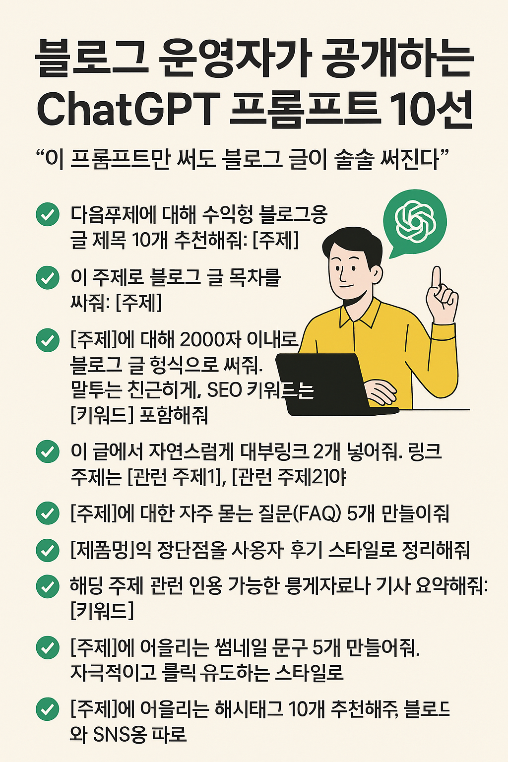 “[주제]에 대해 2000자 이내로 블로그 글 형식으로 써줘. 말투는 친근하게, SEO 키워드는 [키워드] 포함해줘”