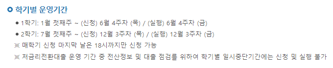 - 일반 상환 학자금 대출 : 최대 10년 거치(이자만 납부), 이후 원리금 분할 상환 (최장 10년간)