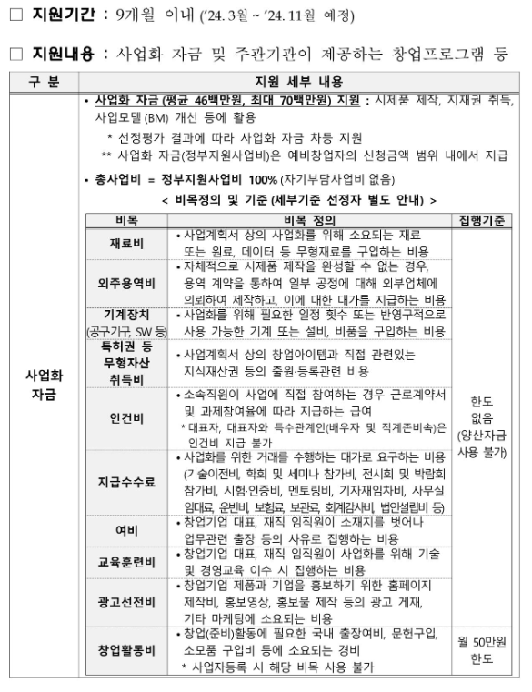 사업화자금(평균 46백만 원, 최대 70백만 원), 창업프로그램등을 지원하는데요.