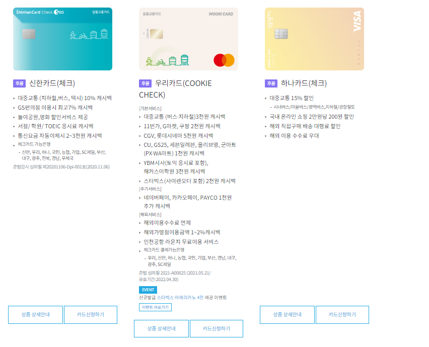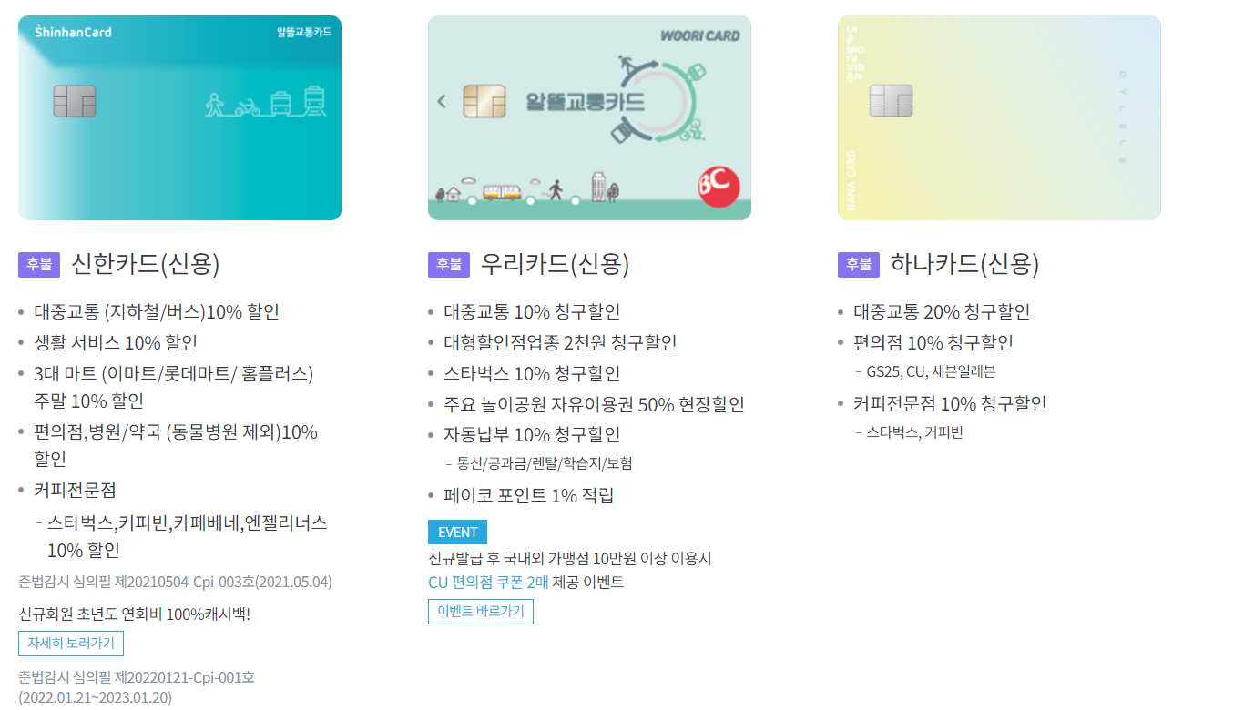 각 카드 회사마다 혜택이 다르니 본인에게 잘 맞는 알뜰교통카드를 신청하시면 됩니다.