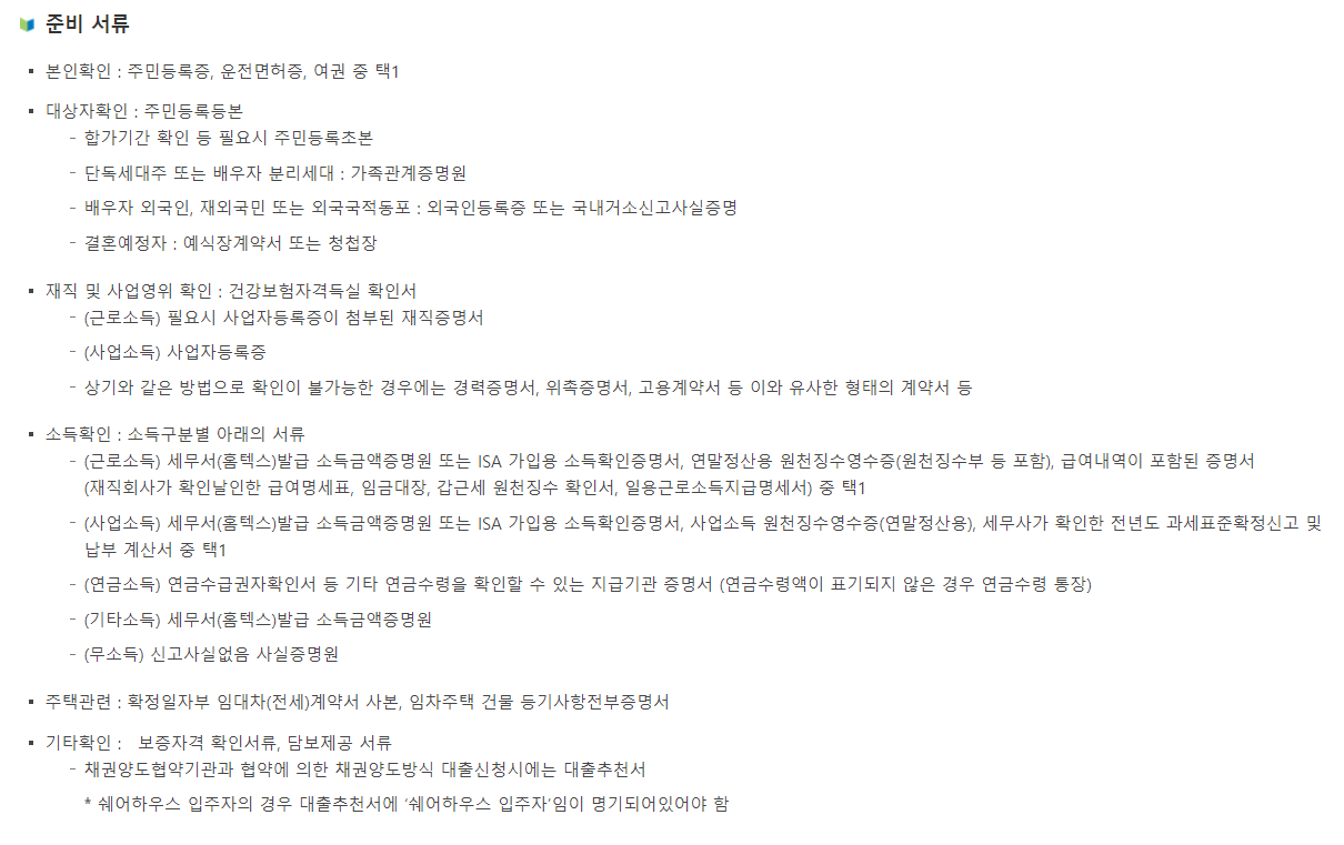 본인확인 서류와 재직 소득에 관련 주택관련 서류도 확인하시고 해당되시는 서류를 준비하셔야 합니다.