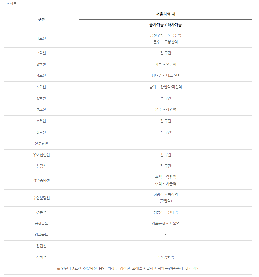 또한, 서울권의 신분당선의 경우는 사용이 붉가능하다고 합니다. 민자노선이기 때문에 적용이 안된다고 하는군요.