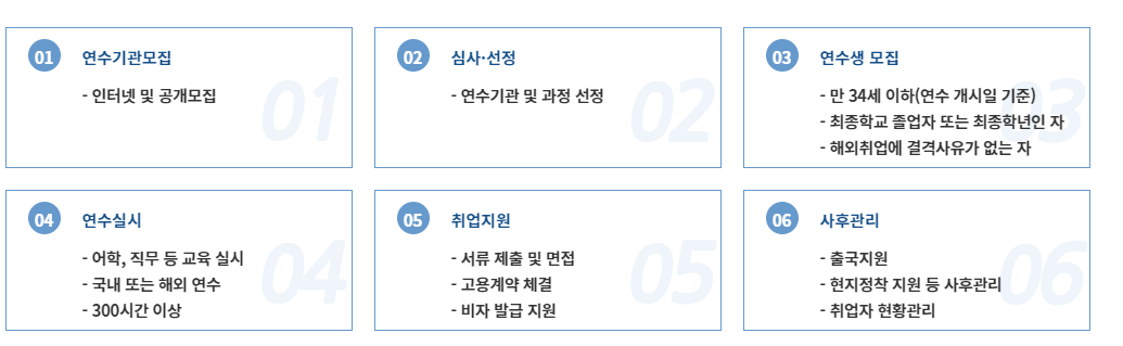 - 만 34세 이하(개시일 기준)로 해외취업에 결격사유가 없는 자(모집인원의 30% 범위 내에서 연력 초과하여 모집 가능)